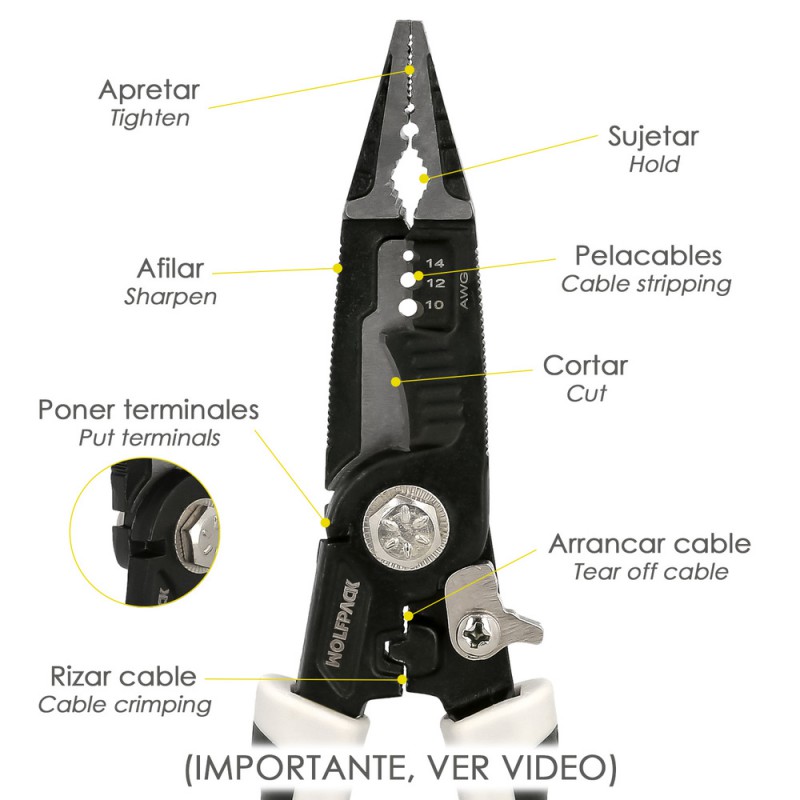 - Alicates multifunción con los que puede Apretar, pelar cables, sujetar, cortar, afilar, poner terminales de cables, arrancar cables o rizar cables.