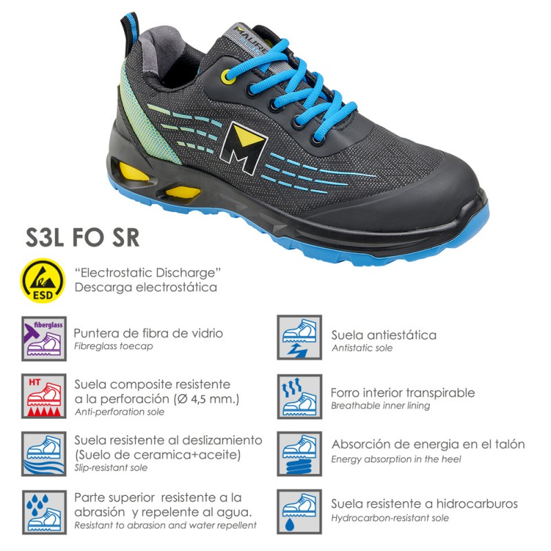 - También conocido como: Zapato de seguridad bajo, Calzado de seguridad S3, Zapato de trabajo con puntera de acero / composite, Zapato de protección laboral bajo.