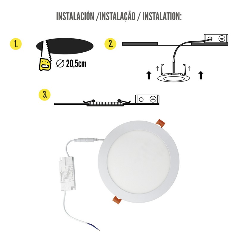 - Artículo también conocido como: Downlight LED redondo, Panel LED empotrable, Lámpara LED 20W, Downlight empotrable LED, Panel LED ahorro energético, Iluminación LED de 1800 lúmenes, Lámpara de techo LED, Downlight LED para interior, Luminaria LED de 20W.