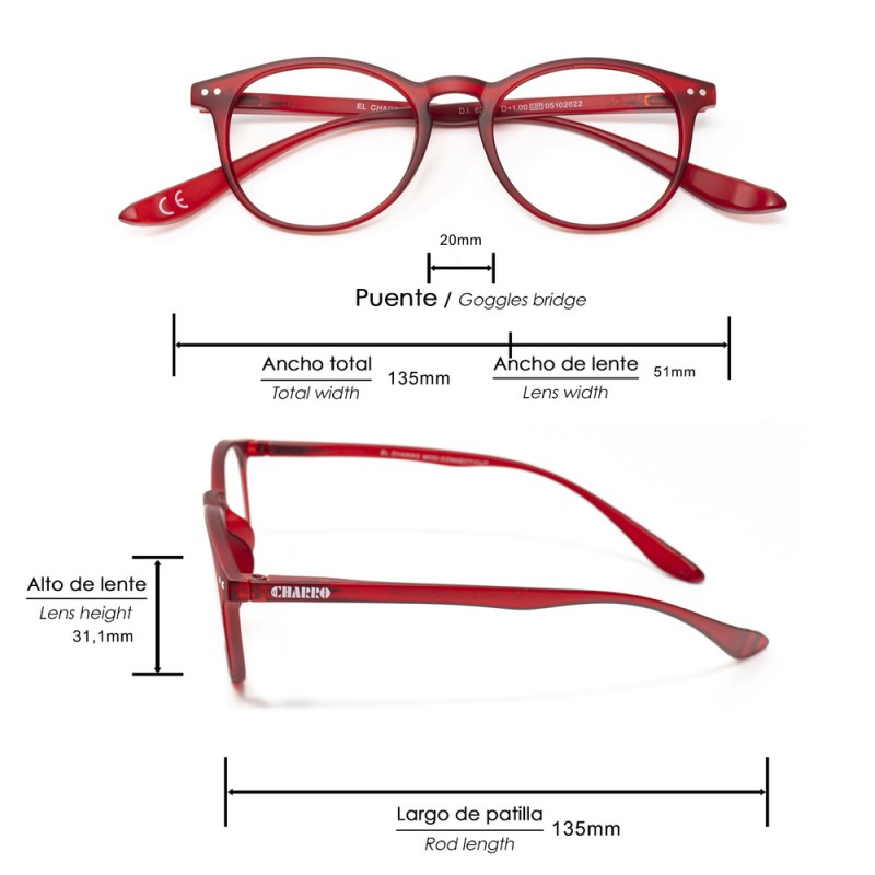 - Gafas de aumento para lectura con montura color rojo con patillas largas.