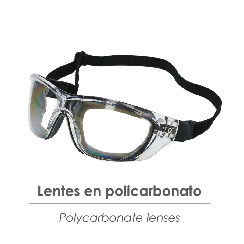 - Lente transparente de policarbonato resistente a impactos, fabricadas con materiales duraderos y no tóxicos.