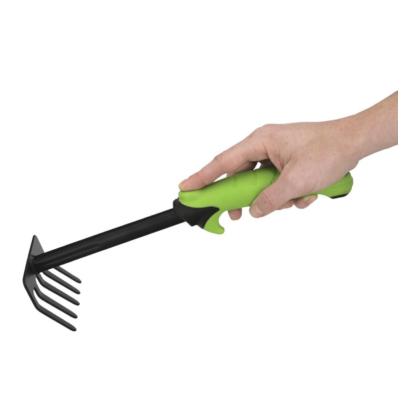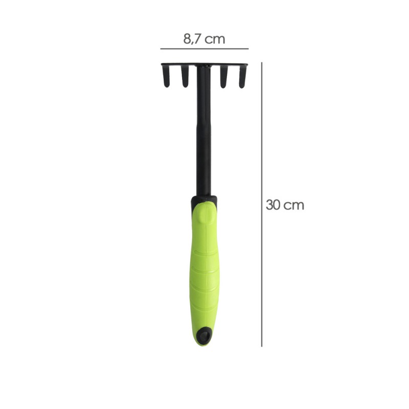 - Con unas medidas de 8,7x30 cm, este rastrillo de jardín de una mano es perfecto para espacios reducidos y para trabajos detallados.