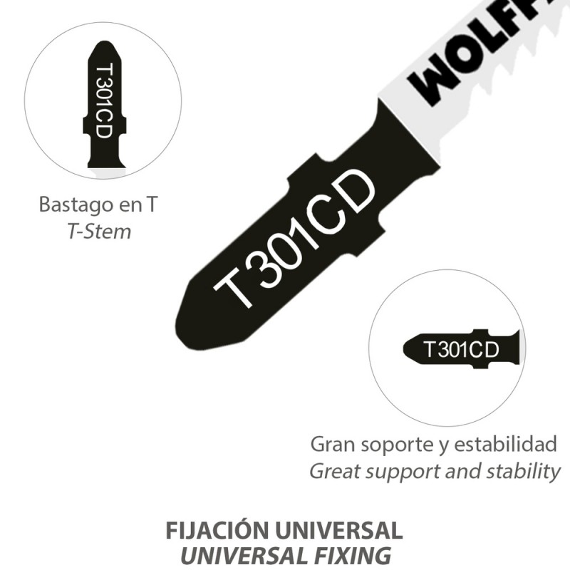 - Vastago en forma de T, compatible con la mayoría de modelos de sierra de calar.