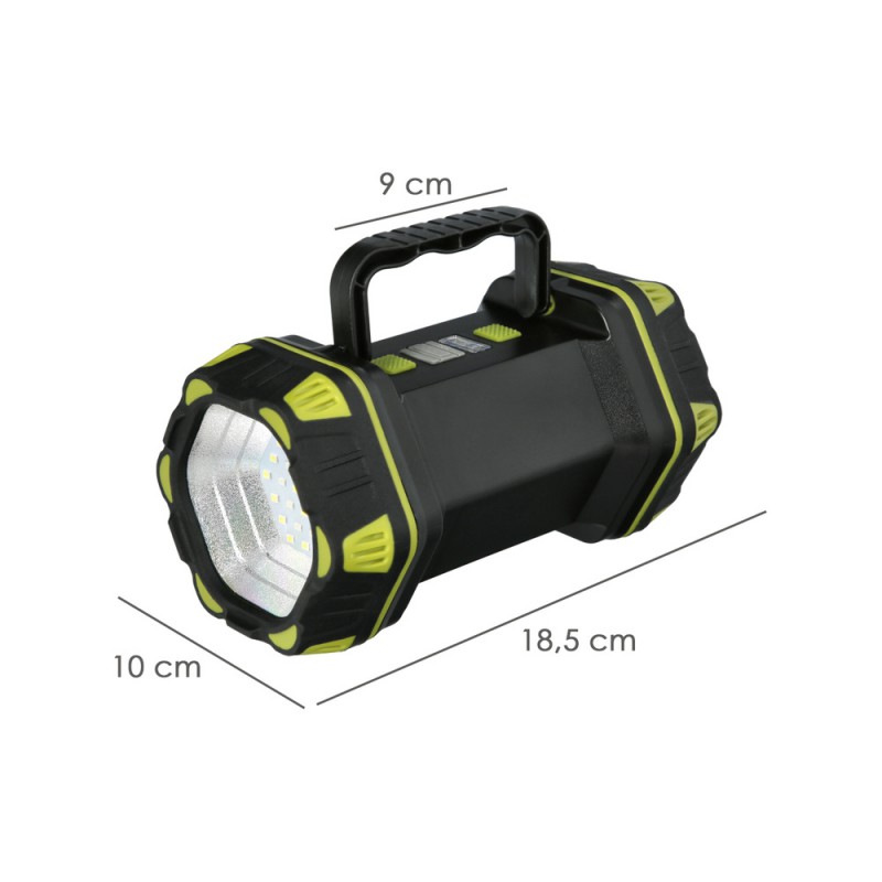 - Esta linterna también funciona como banco de carga, por lo que podrás cargar tus dispositivos electrónicos en caso de emergencia. Su asa rotativa de 180º te brinda la flexibilidad necesaria para ajustar la dirección de la luz según lo requiera la situación.