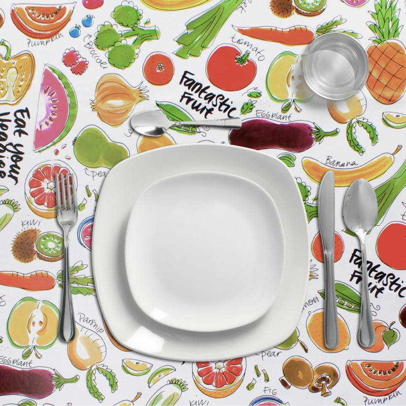 - Mantel Hule estampado en color blanco con estampado de fruta fantasia. Diseño moderno y elegante para cualquier ocasión.