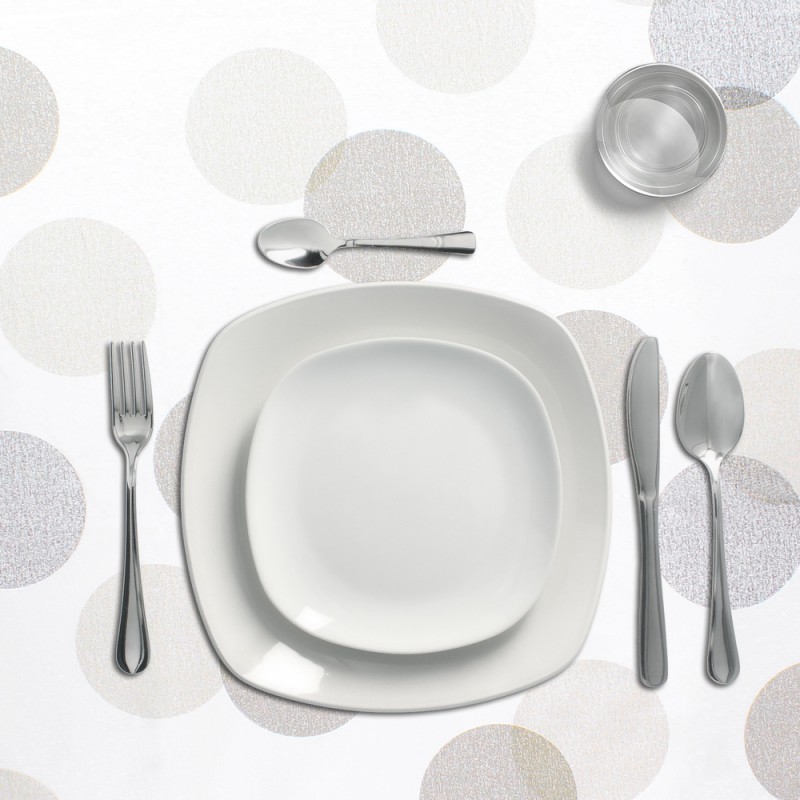 - Mantel Hule estampado en color blanco con formas circulares en tonos de gris y beige. Diseño moderno y elegante para cualquier ocasión.