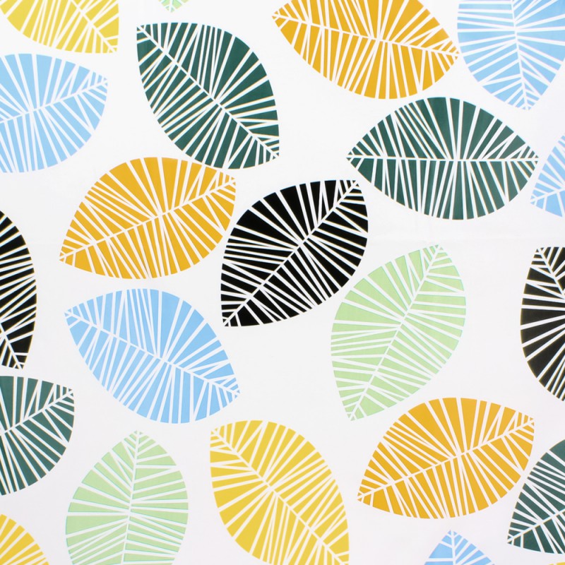 - Mantel Hule estampado con fondo en color blanco con formas hojas en varios tonos de color. Diseño moderno y elegante para cualquier ocasión.