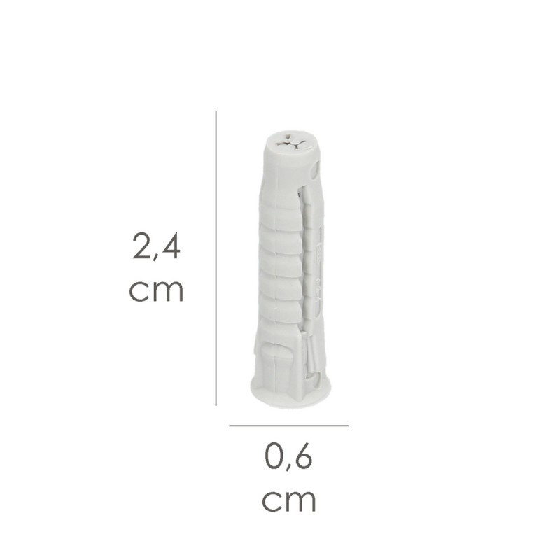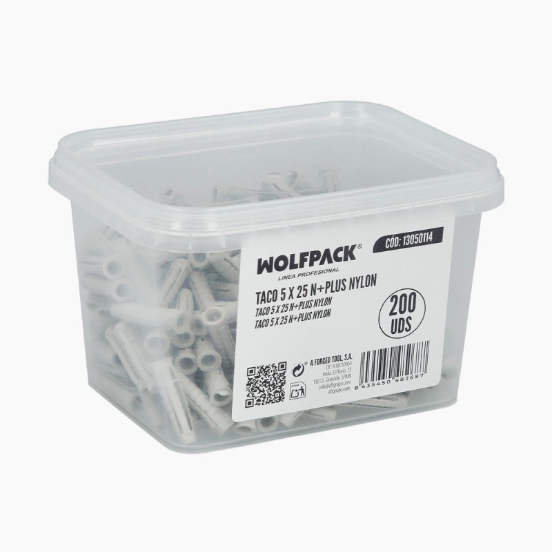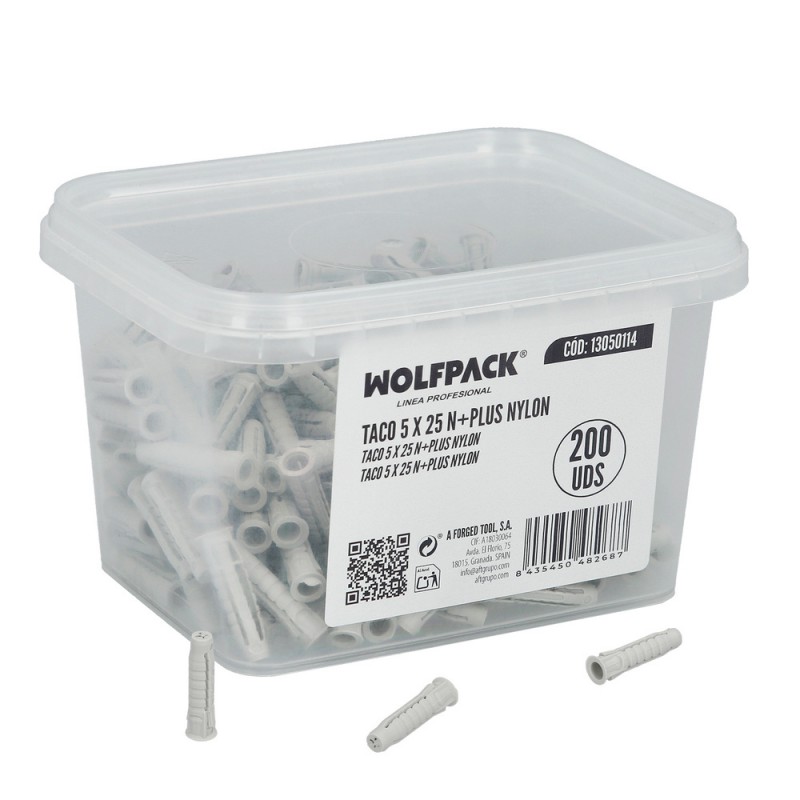 - Artículo también conocido como taco 5x25, taco nylon, taco de expansión, taco para pared, tacos fijación ligera, taco PA6, taco expansión cuádruple, taco nylon gris, taco construcción, etc.
